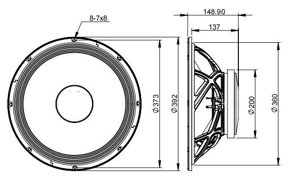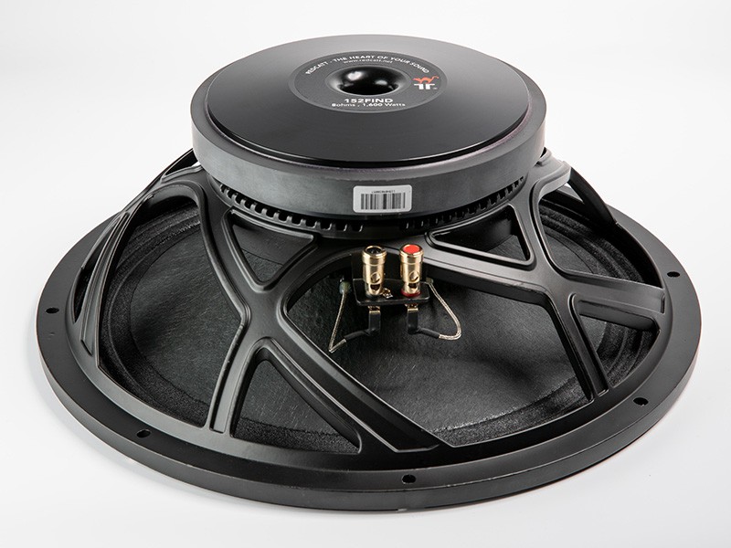 he 152FIND-115 is a high efficiency, (99 dB 1watt / 1 meter) 15-inch woofer with incredibly linear frequency response characteristics, high power handling capability while generating low harmonic distortion artifacts. The 152FIND-115 uses a lightweight carbon fiber loaded cone assembly along with a high excursion triple roll constant geometry surround. This combination provides remarkable strength, high efficiency and a peak to peak maximum excursion of 15mm.Power HandlingAt the core of the 152FIND-115 is it’s voice coil technology featuring a composite Polyimide former material capable of withstanding peak temperatures in excess of 280C, well beyond the thermal requirements of modern professional audio systems. The 152FIND-115 cone and dust cap are made using an advanced carbon fiber loaded REDCATT pulp. The woofer cone is also extensively treated to withstand harsh environments and high humidity. Metal parts in the speaker assembly are coated for extreme weatherization protection.